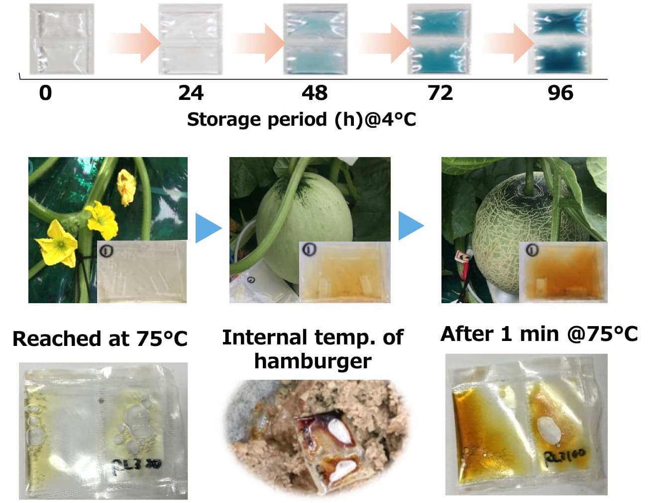 The quality of all primary products, including vegetables, fruits, meat, and marine products, is greatly affected by the temperature conditions during the process from production to distribution and consumption. Therefore, thorough temperature control is required for high quality. In modern times, various temperature recording sensors have been developed, and it is possible to acquire the temperature in the distribution process in real time. However, it is still difficult for workers to grasp instantly at the production and distribution sites. We are working on the development of the integrated temperature indicator, a tool that allows you to easily check the temperature history (integrated temperature) visually on the spot. With the technology based on the Maillard reaction that we are developing, we can provide temperature indicators that can be used in a wide range of temperature ranges from freezing and refrigeration distribution storage to cooking.